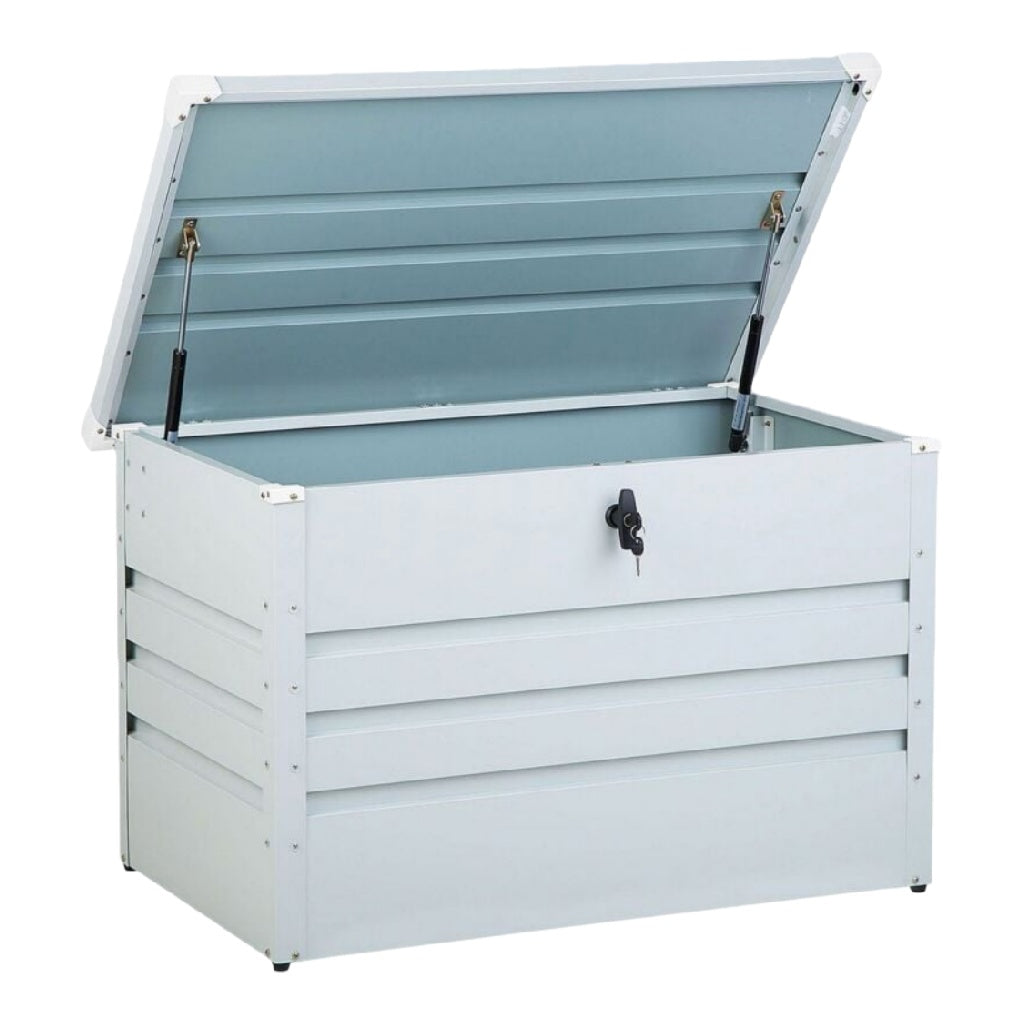 Arcón de almacenamiento metálico con tapa abatible, amortiguadores de gas y cerradura, acero galvanizado, blanco